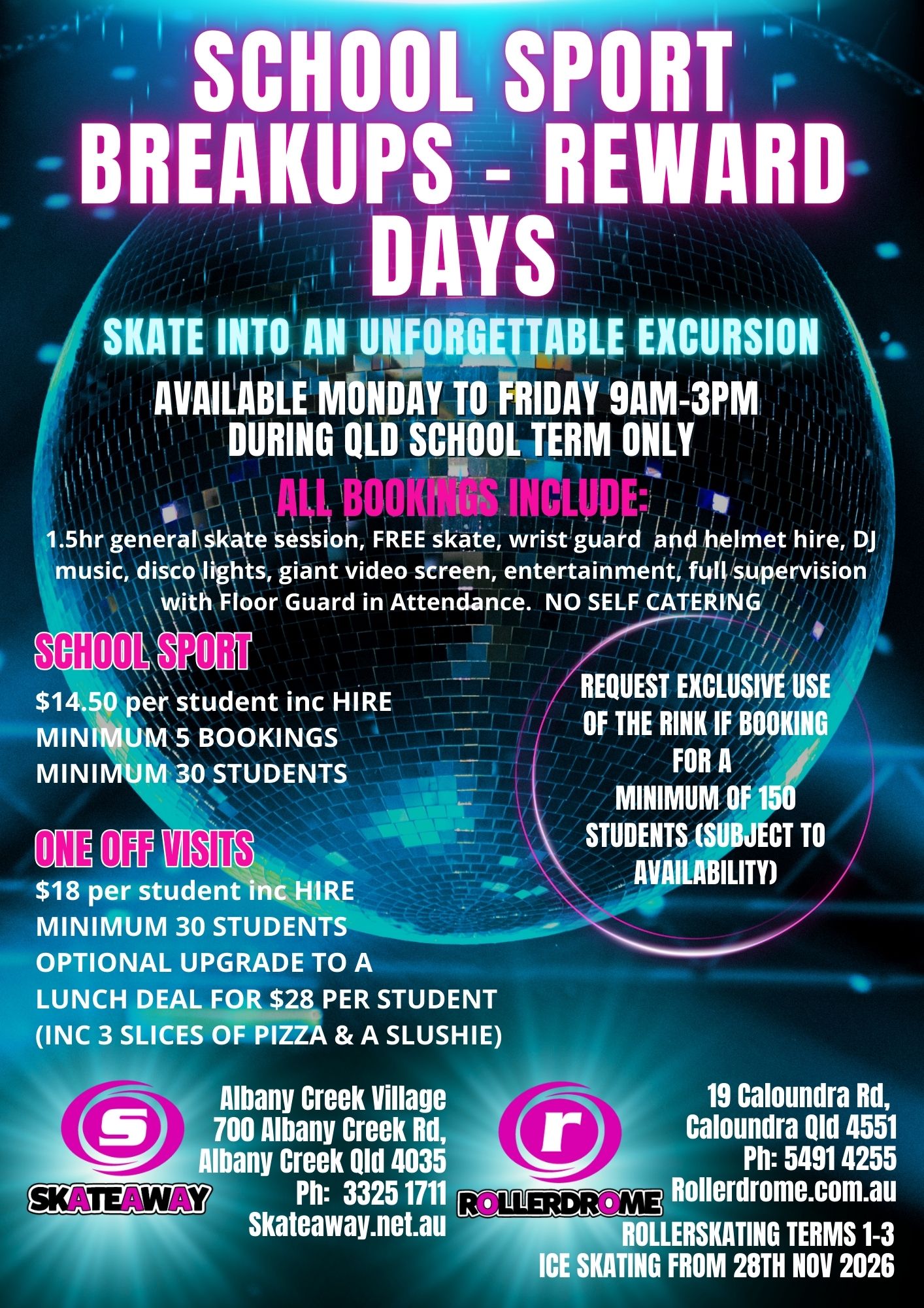 Skate & wrist guard hire, DJ music, disco lights, giant video screen, entertainment, full supervision with floor guard.